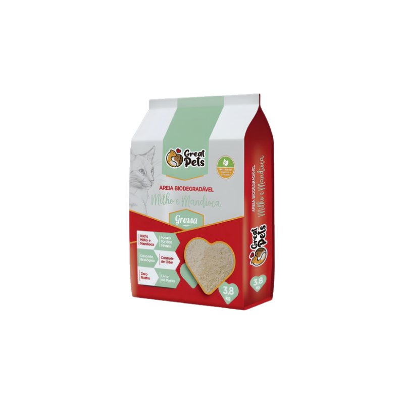 <p>A Areia Higiênica Great Pets Biodegradável Grossa é uma opção de areia sanitária para gatos que é produzida com materiais naturais e biodegradáveis, tornando-a uma opção mais sustentável para o meio ambiente. Não contém produtos químicos nocivos, sendo segura para o uso dos gatos e para o contato humano. Além disso, por ser biodegradável ela pode ser descartada no vaso sanitário, o que facilita o processo de limpeza e descarte Benefícios: Indicada para gatos de todas as raças; Biodegradável; Forma torrões firmes e flexíveis; Super absorvente; Não forma lama; Pode ser descartada no vaso sanitário. Composição: Feita com grãos de origem vegetal, tais como amido de milho, mandioca e fibras de madeira, o que garante que a areia seja absorvente e eficiente na retenção de odores desagradáveis. Por ser uma areia fina, ela é suave para as patas dos gatos e ajuda a evitar que a urina e as fezes do gato se espalhem pela casa, mantendo a limpeza do ambiente.</p>
