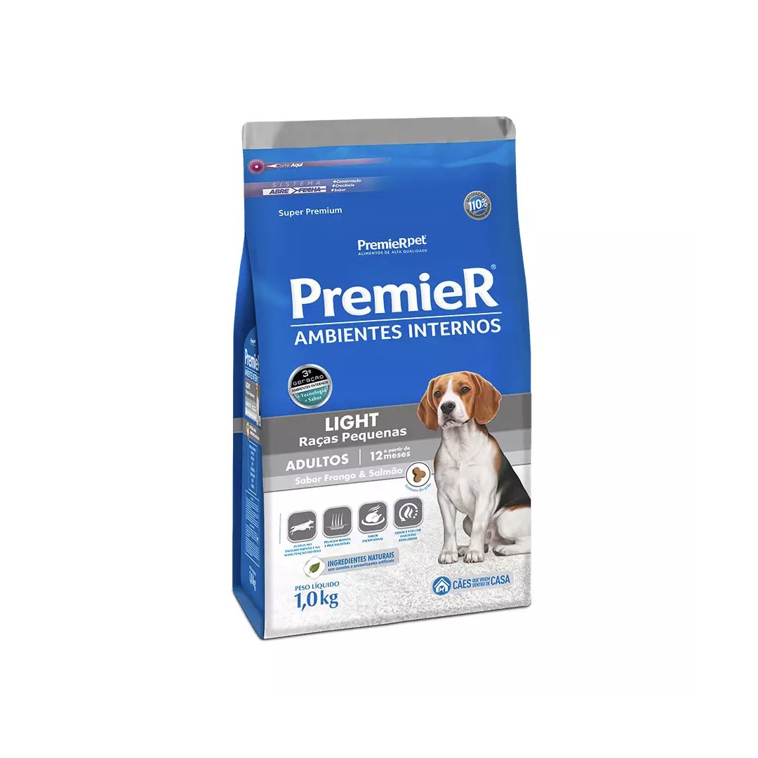 Cães Adultos que vivem dentro de casa, em contato próximo com seus donos, têm necessidades nutricionais especiais | PremieR Ambientes Internos Light Adultos é um alimento Super Premium destinado a estes cães, com o objetivo de mantê-los em forma, através da redução ou controle do peso | Sua fórmula exclusiva tem níveis reduzidos de gorduras e calorias, além de excelente sabor conferido pela inclusão de salmão | Para reduzir o volume e o odor das fezes, PremieR Ambientes Internos Light Adultos tem uma combinação exclusiva de fibras especiais e extrato de yucca.