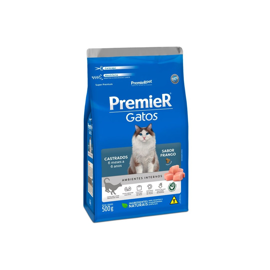 RAÇÃO PREMIER GATOS CASTRADOS 6 MESES A 6 ANOS FRANGO Tamanho:500G